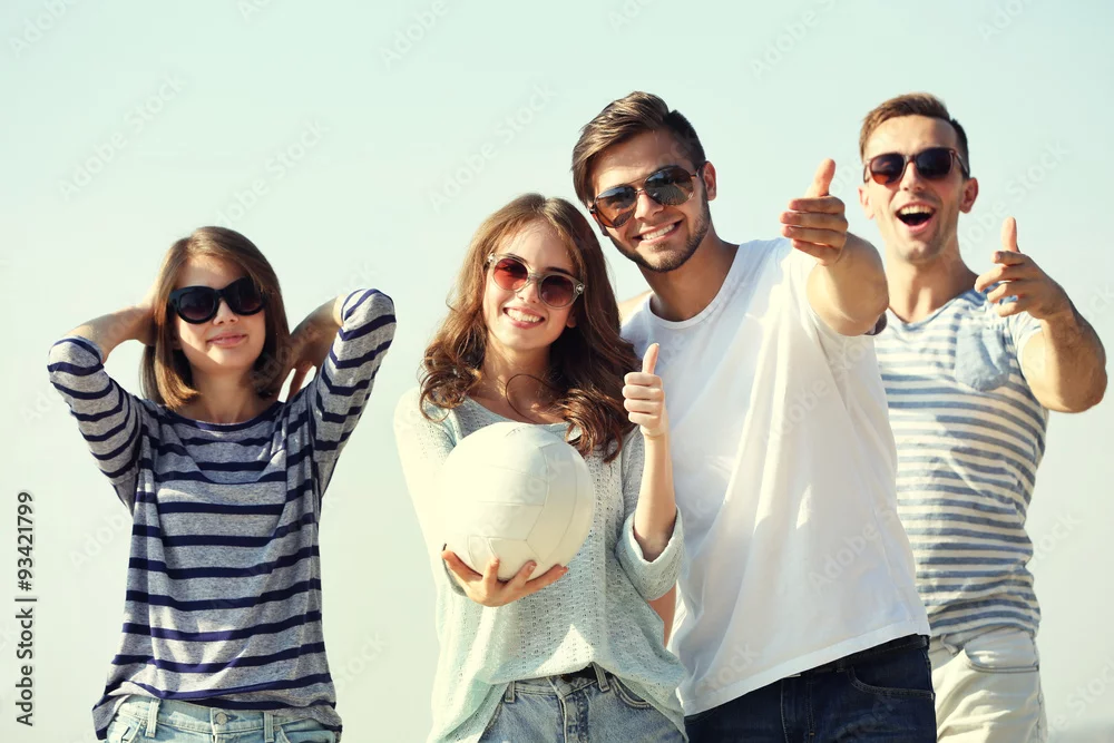 Young people playing with ball on the riverside