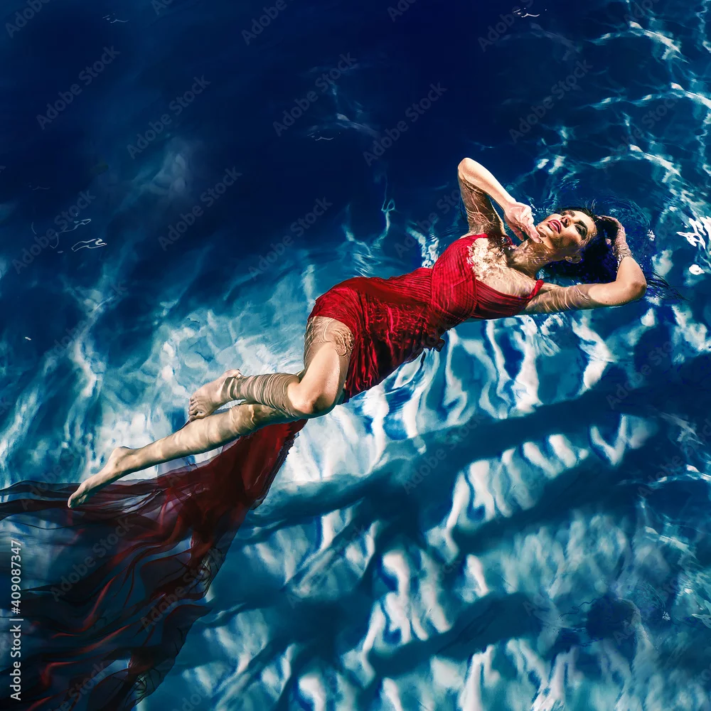young woman in a red dress on the water. Girl swims in the water in a dress with a long train