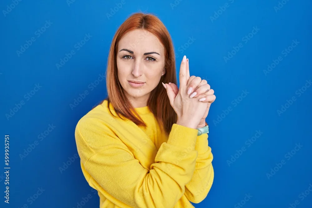 Young woman standing over blue background holding symbolic gun with hand gesture, playing killing shooting weapons, angry face