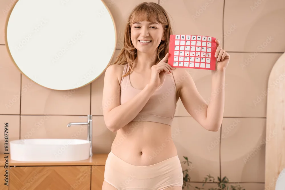 Young woman with menstrual calendar in restroom