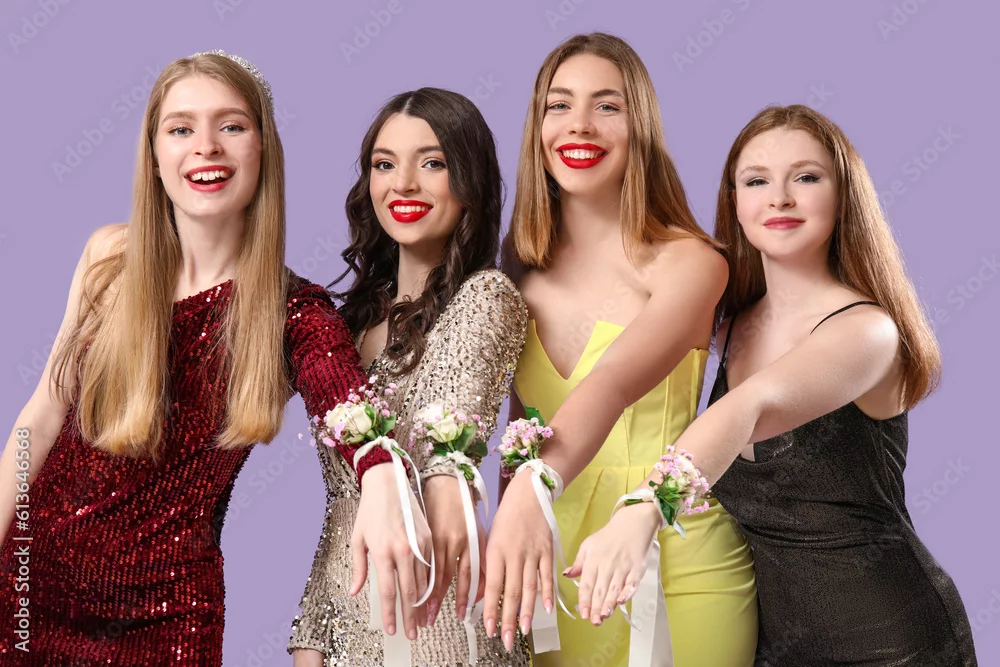 Young women dressed for prom with corsages on lilac background