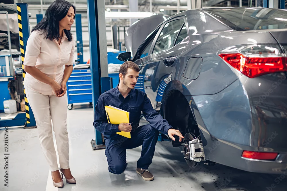 Auto car repair service center. A female customer and mechanic checking car breaks