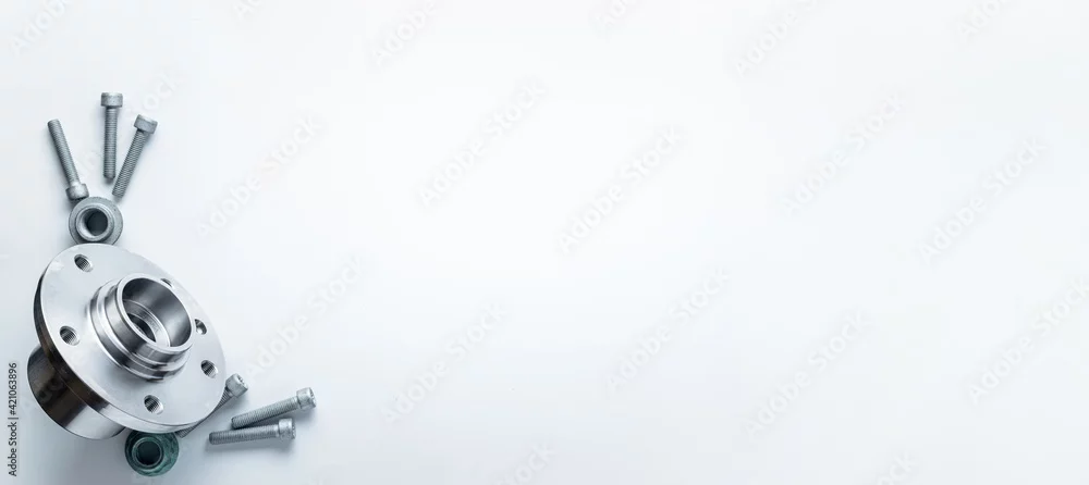 Auto equipment. Auto motor mechanic spare or automotive piece on white banner background. Set of new metal car part. Repair and vehicle service with space ...