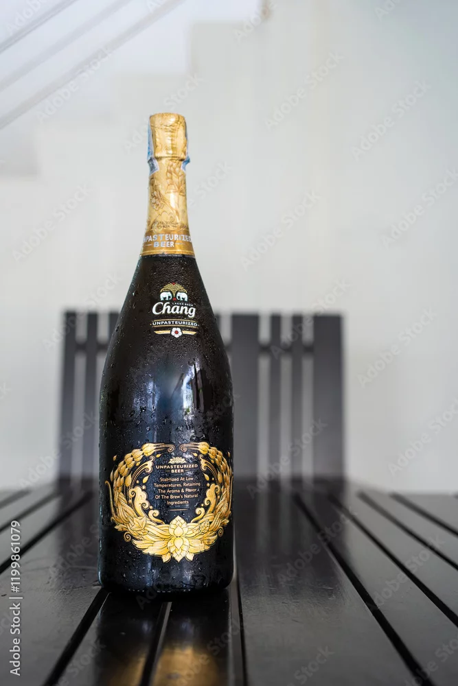 Bangkok, Thailand - January 16, 2025 : The cold beer Chang Unpasteurized from ThaiBev Owner of Chang Beer Products