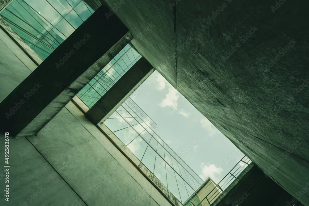 Bottom view modern glass office building. Exterior office glass building architecture. Company glass window. Skyscraper corporate building. Financial business ...
