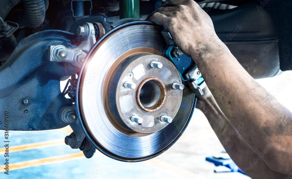 Close up car disk brake pad replacement service with hand of mechanic man in car garage and copy space, use for disk brake service content
