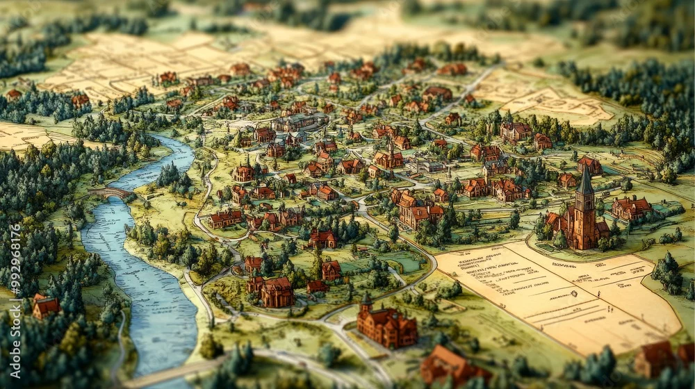 detailed map of a town featuring cadastral boundaries, property lines, and land parcels. The map includes a variety
