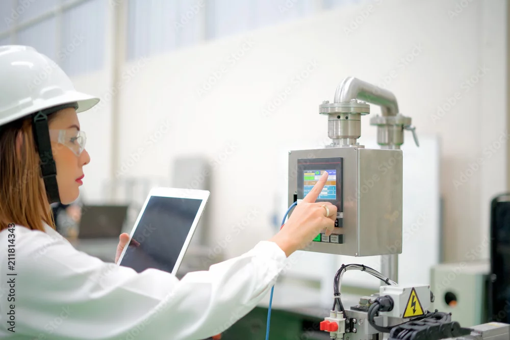 Factory worker is programming a CNC milling machine with a tablet computer.