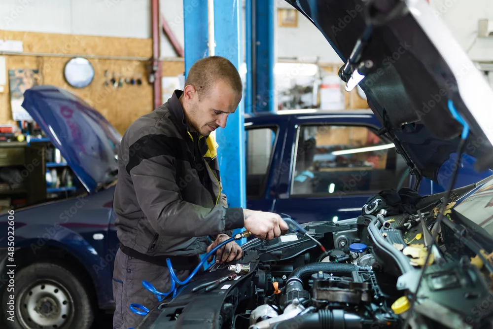 Handsome mechanic in uniform is working in auto service garage. Repair service.