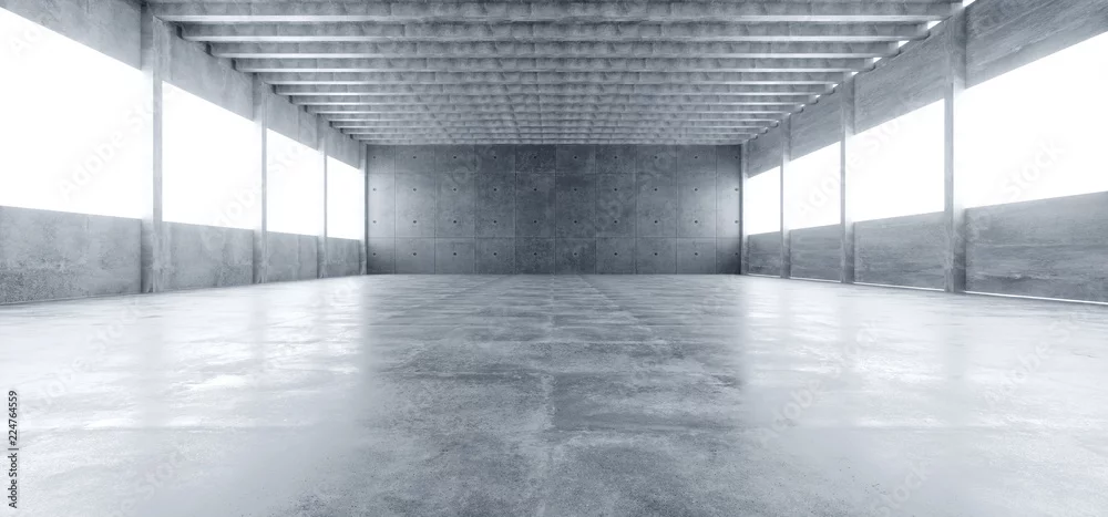 Modern Huge Concrete Material Empty Hall With Many Columns And Big White Glowing Windows Wallpaper Space For Text 3D Rendering