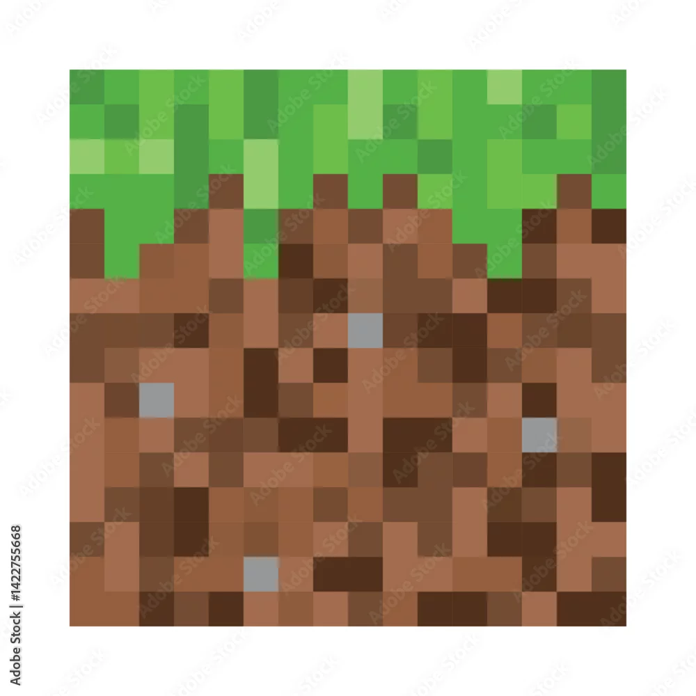 Pixel art grass and dirt block isolated on white. Ground texture game cube vector craft template