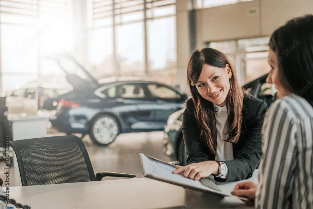 Saleswoman showing contract to customer.