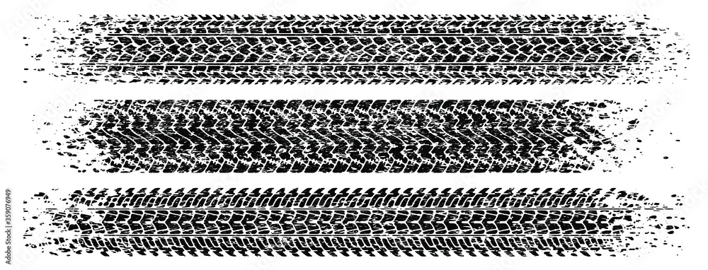 Set of three shabby, grunge style, dirty vector traces of tires.