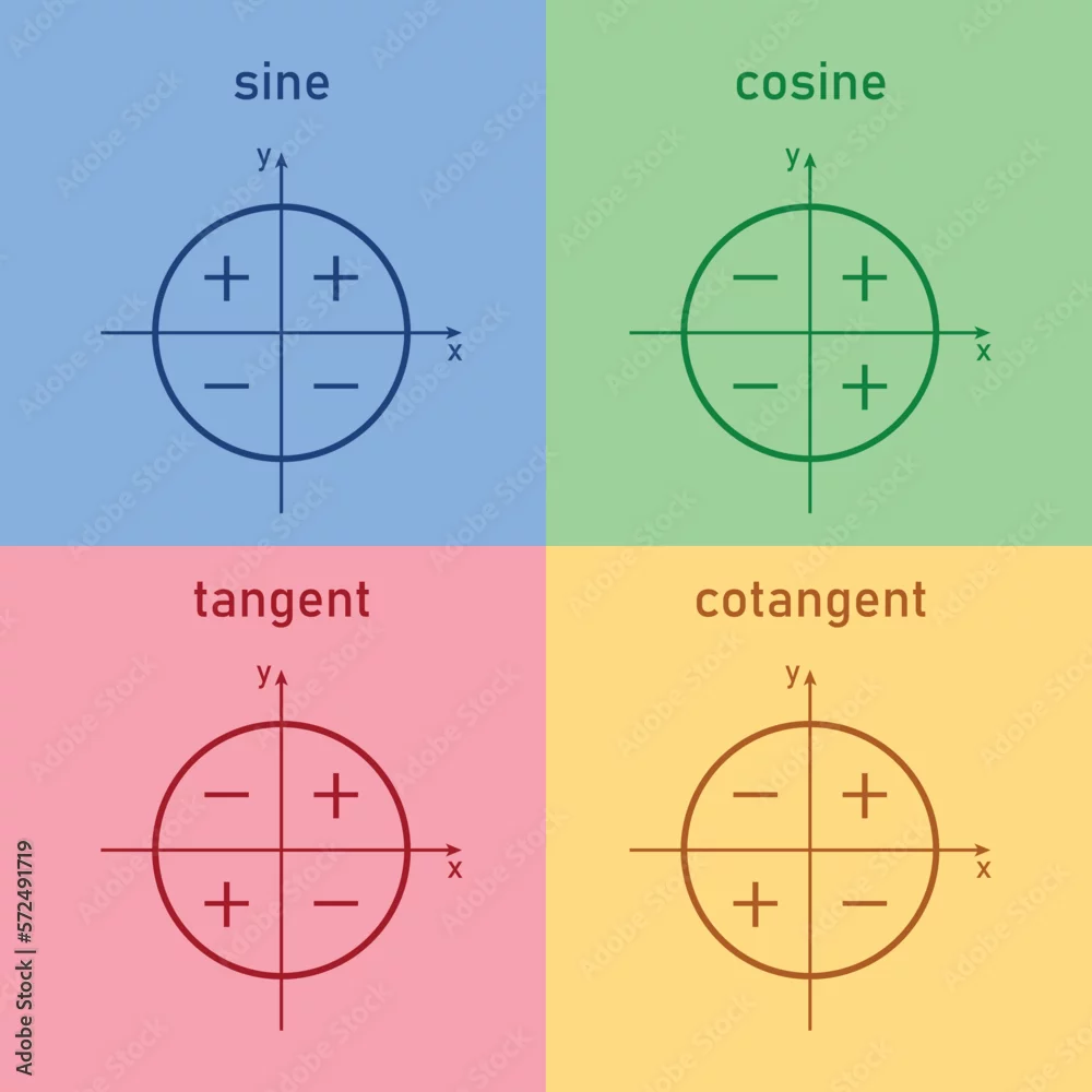 Sign of trigonometric functions in quadrants. Sine, cosine, tangent and cotangent signs.