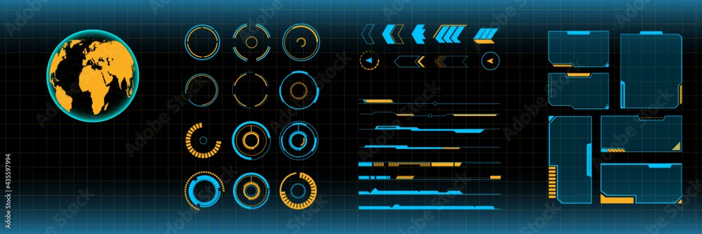 Virtual Reality Inteface | Set of Sci-fi Menu Elements | Hud parts for screen | Aim, grid, frames and arrows