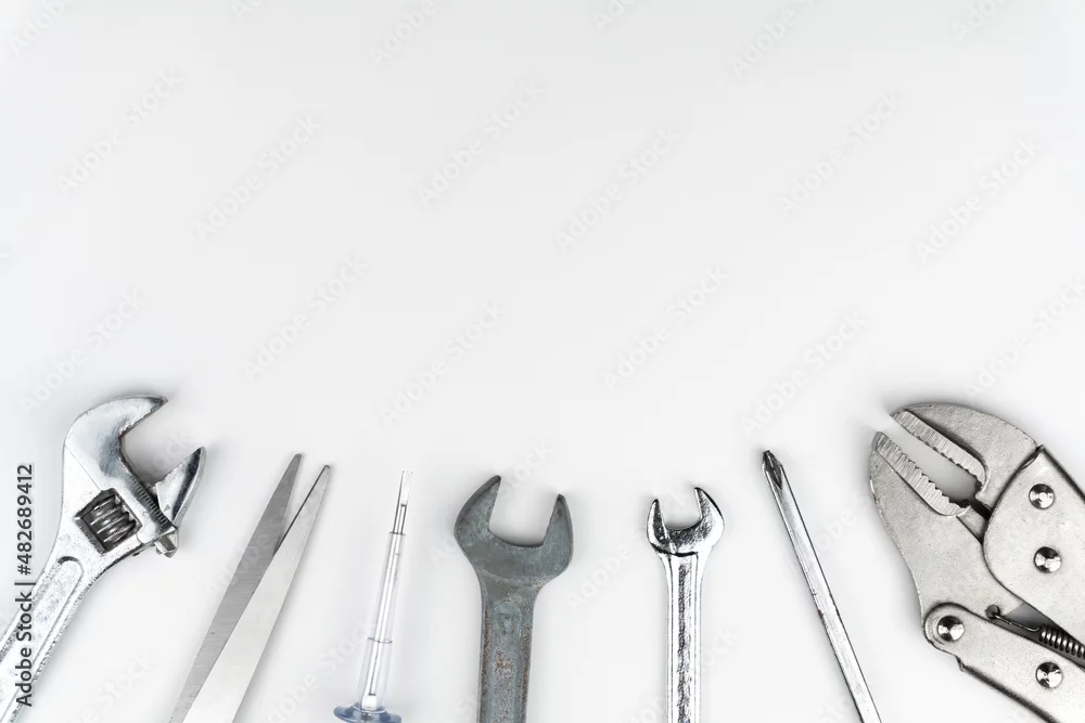 Worktable top view of Repair tools Flat lay composition on white background, construction and home DIY, space for text