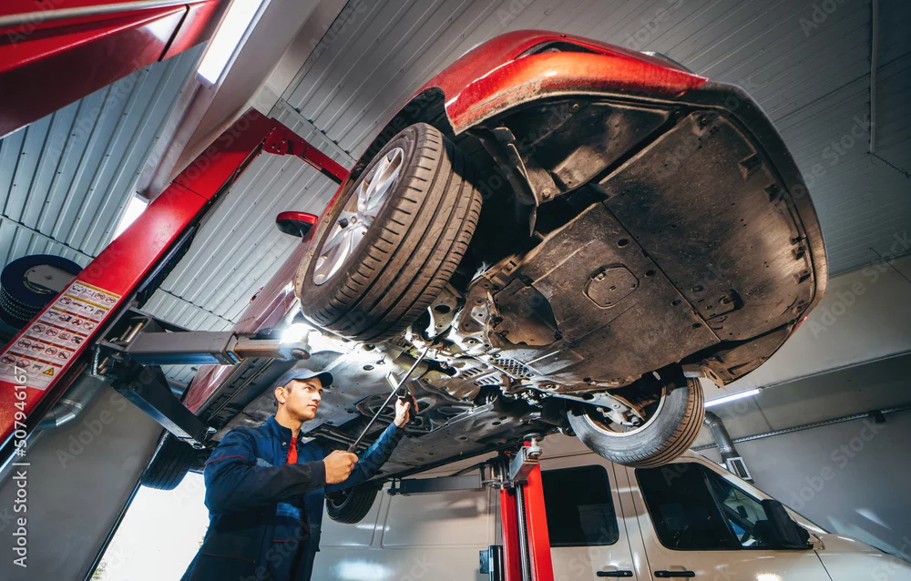 Young car mechanic at repair service station inspecting car wheel and suspension detail of lifted automobile. Bottom view.