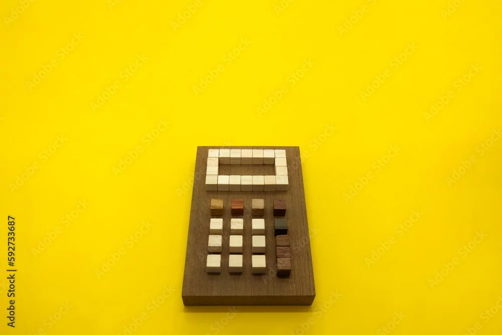 黄色い背景の上に木の素材で形を作った天然の電卓