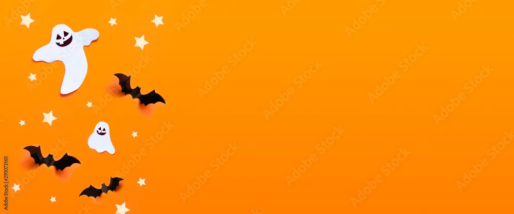 Autumn holiday composition. Halloween celebration concept with bats, ghost, spider web, stars over a orange background.