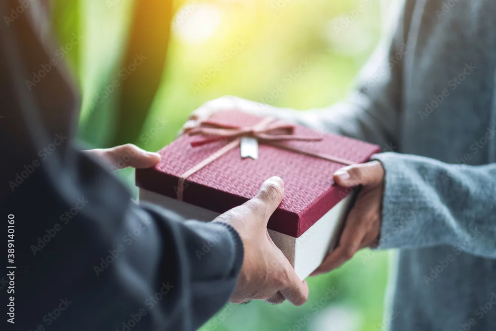 Closeup image of a man giving a woman a gift box