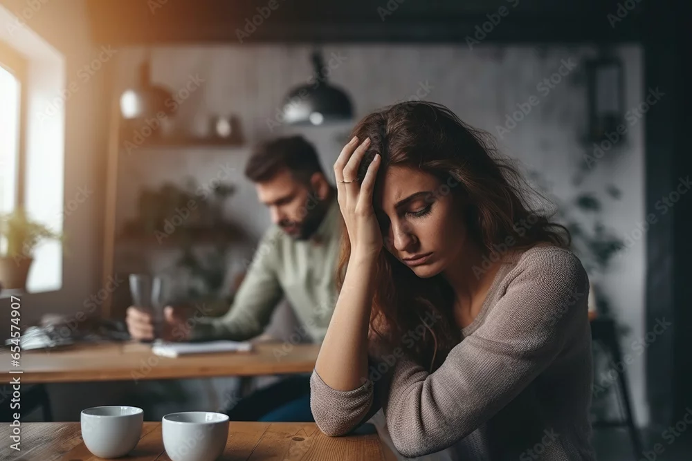 Couple, divorce and headache in conflict, fight or argument on the living room sofa at home. Woman and frustrated man in depression, cheating affair or ...