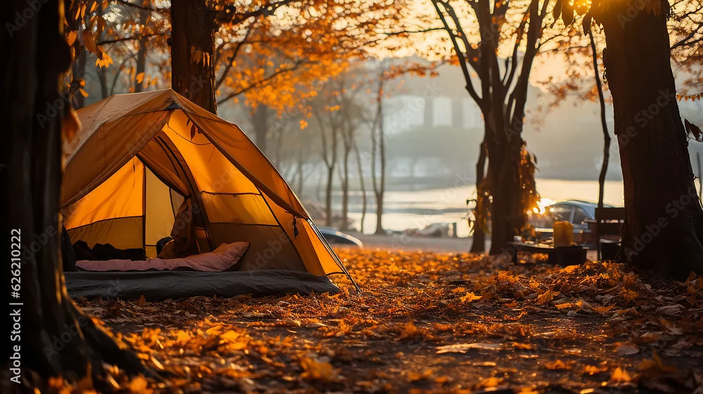 tourist tent in the autumn forest hiking adventure vacation in the autumn camp. Generative AI