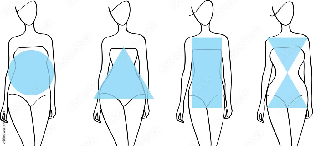 Woman body shapes. Apple, pear, hourglass, rectangle. Round, triangle shapes. Swimsuit shapes. Women body shapes line drawing. Female body shape.