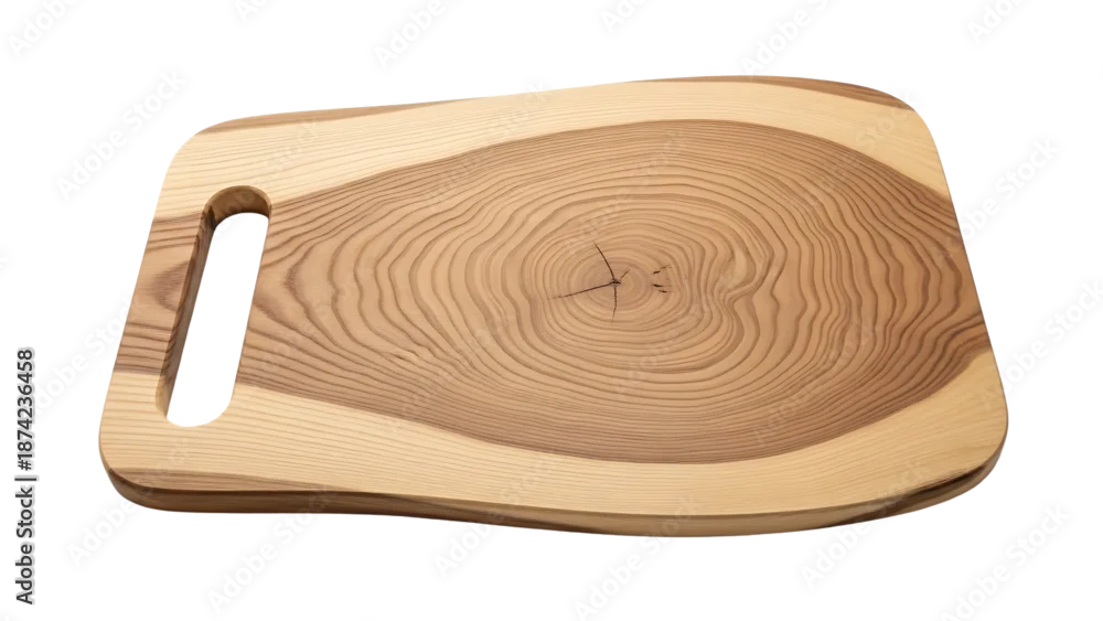 Single light wood cutting board with concentric grain pattern and finger slot detail isolated on a transparent background