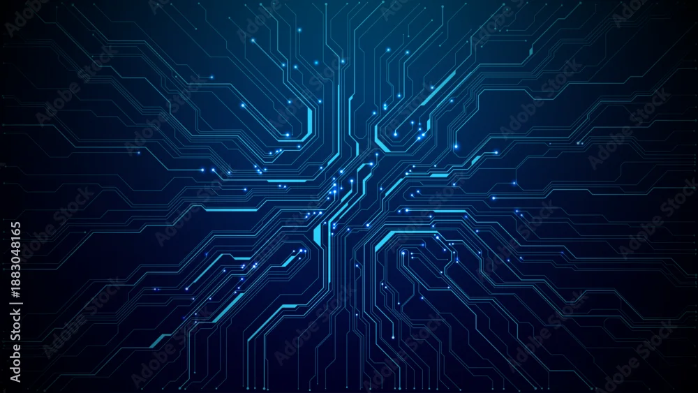 Abstract tech background featuring circuit patterns and blue chip design. Digital board texture with electronic lines for futuristic data concepts. Digital ...