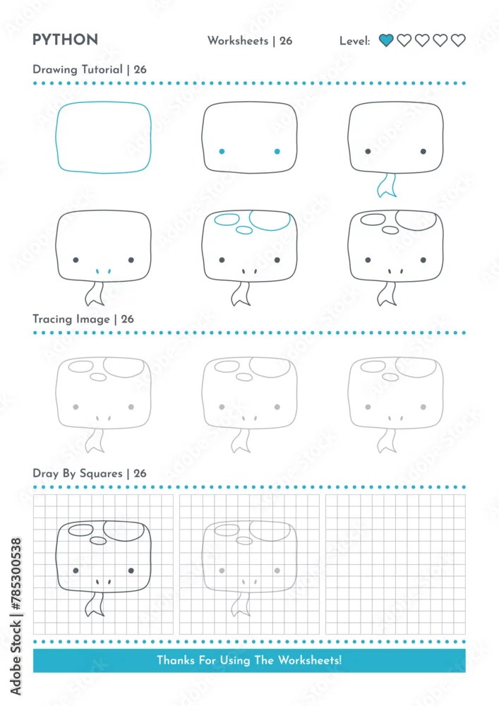 How to Draw Doodle Python, Cartoon Character Step by Step Drawing Tutorial. Activity Worksheets For Kids