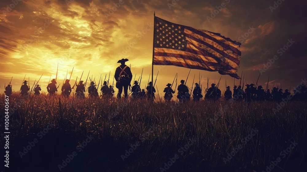 Patriotic Patriots: Historic Reenactment of Revolutionary War Battle with Soldiers in Period Costumes and American Flag Raised High