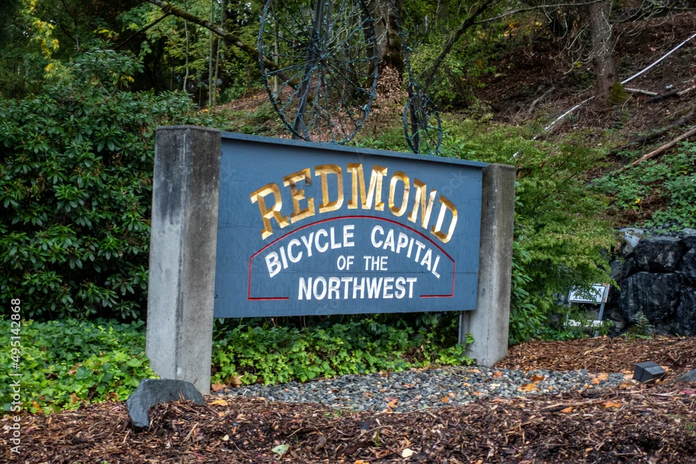 Redmond, WA USA - circa August 2021: Angled view of the Redmond Bicycle Capital of the Northwest sign near Lake Sammamish.