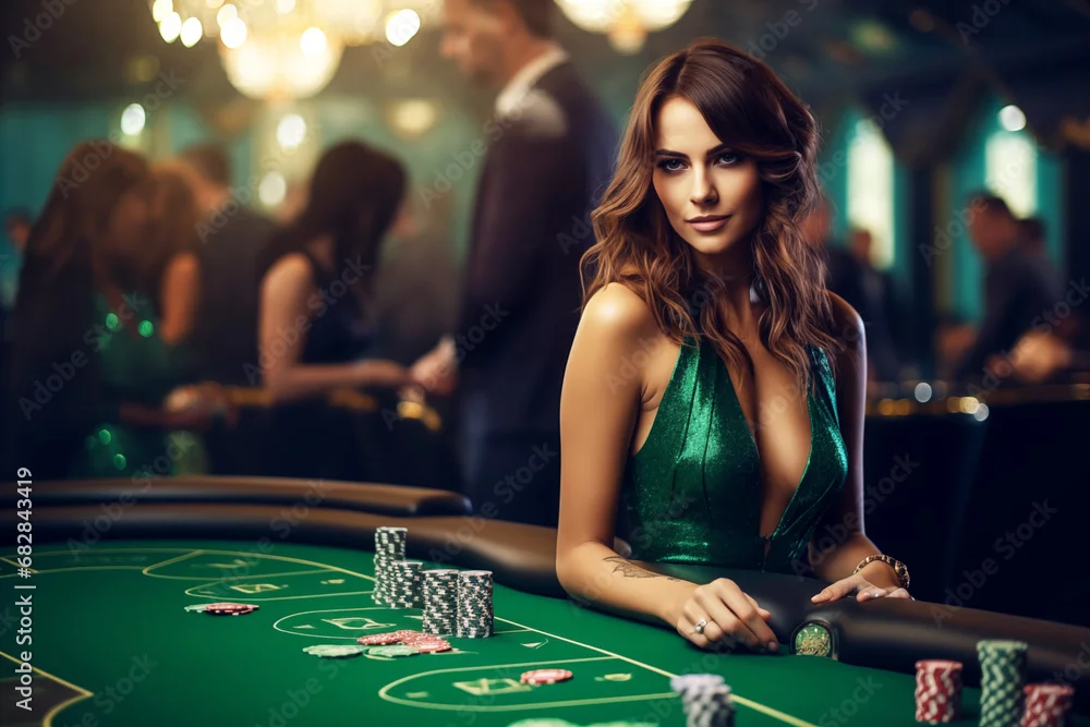 Casino, beautiful young girl in a green dress. Banner concept for casino, poker, gambling, croupier, website header, gambling, luxury style, baccarat. Casino winning poster