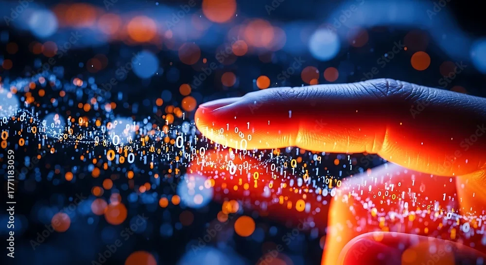 Closeup of a finger touching a stream of glowing digital data particles and binary code