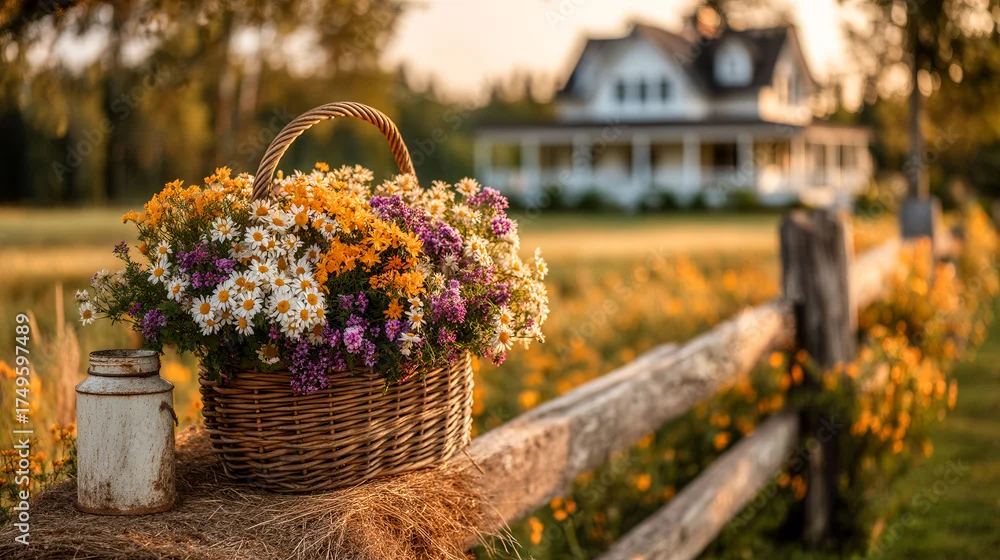 A basket of flowers sits on a fence post next to a house. The flowers are yellow, purple, and white, and they are arranged in a way that makes them look like they are in a vase. The scene is peaceful