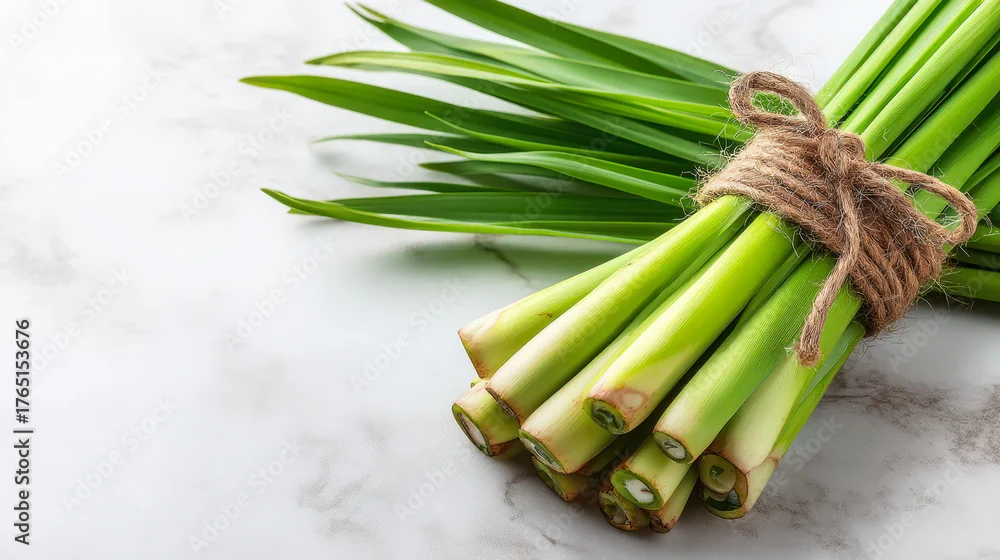 A bunch of green herbs are tied together. The herbs are fresh and green, and they are arranged in a neat bundle. The bundle is placed on a white surface, ...