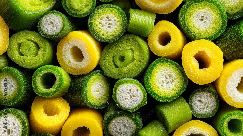 A close up of green and yellow vegetables. The vegetables are cut into small pieces and arranged in a way that they look like they are in a pile. Concept ...