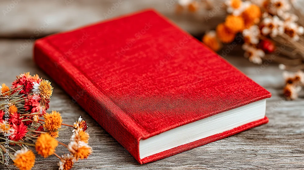 A red book with a white spine sits on a wooden table. The book is open to a page with a flowery border. The flowers are orange and yellow, and they are scattered around the book