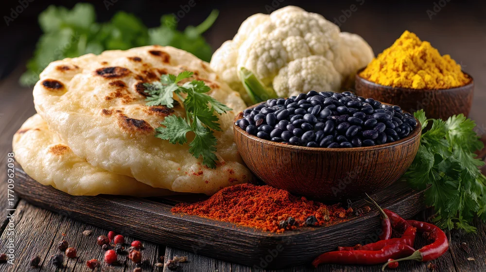 A wooden table with a variety of food items including beans, rice, and vegetables. The table is set with a bowl of beans, a bowl of rice, and a bowl of ...