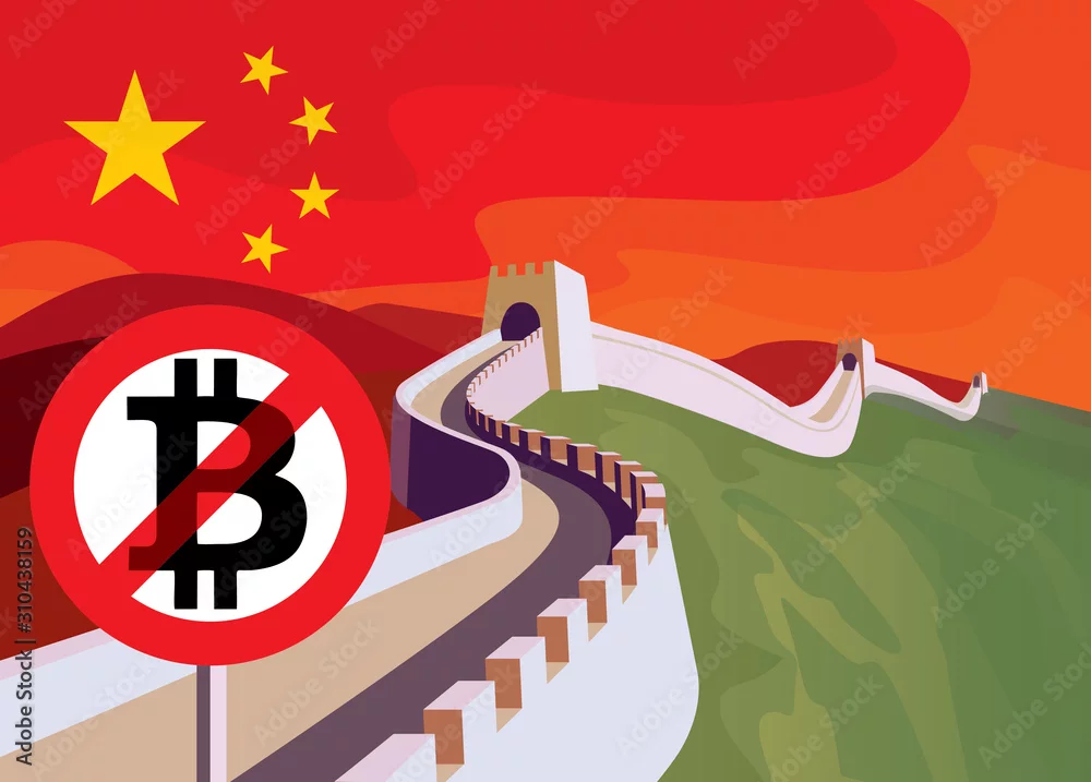 Bitcoin trade is limited in China. Prohibition of trade in bitcoins. Bitcoin decline. Blockchain cryptocurrency crisis. Crypto currency devaluation. The great Wall of China with prohibition sign.