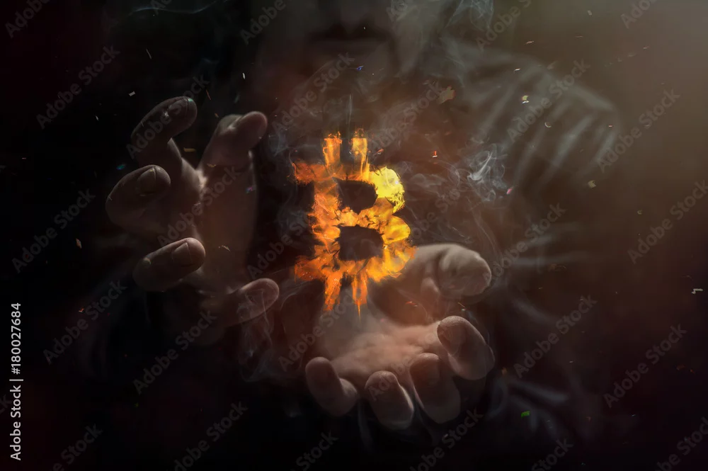 Burning symbol of bitcoin with man in the background. Conception of risk management in money trading at currency market
