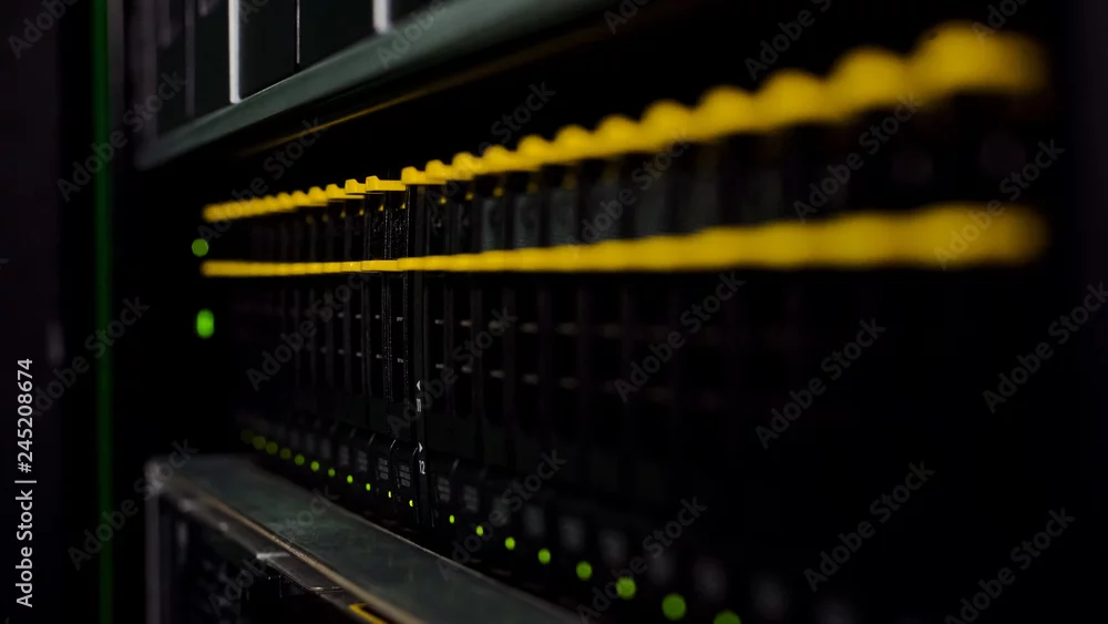 Data storage illuminated with led, networking connection, server racks closeup