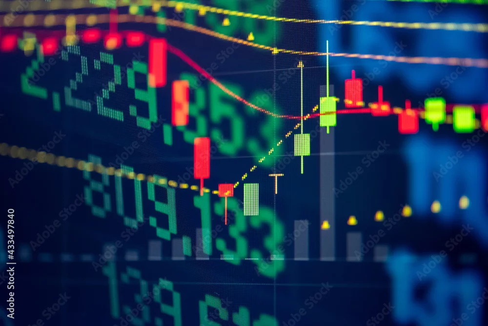Financial data of stock market in term of a digital prices on LED display. A number of daily market price and quotation of prices chart to represent candle stick tracking in Forex trading.