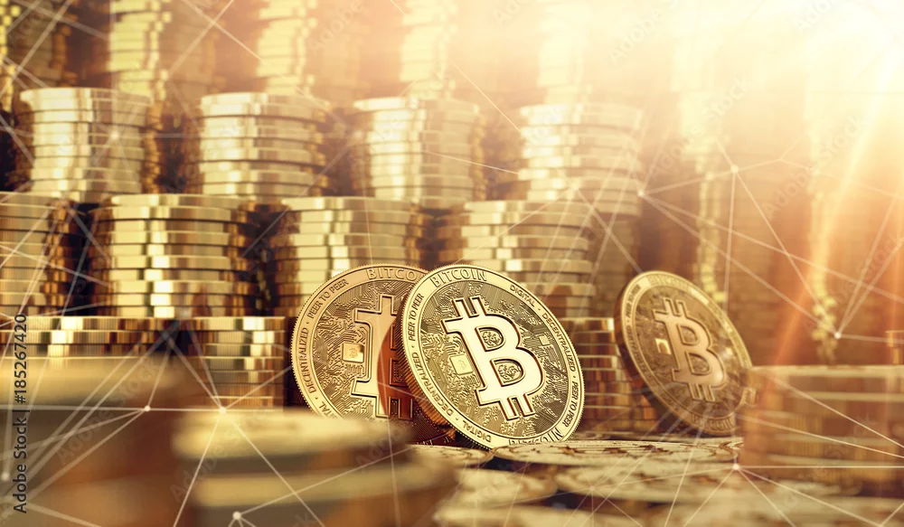 Golden Bitcoin coins and blockchain nodes around in blurry closeup. Copy space above. 3D rendering
