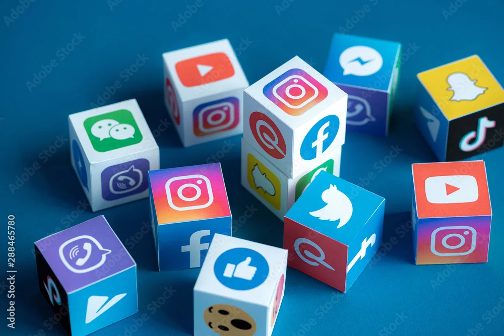 Kyiv, Ukraine - September 5, 2019: A paper cubes collection with printed logos of world-famous social networks and online messengers, such as Facebook, Instagram, YouTube, Telegram and others.