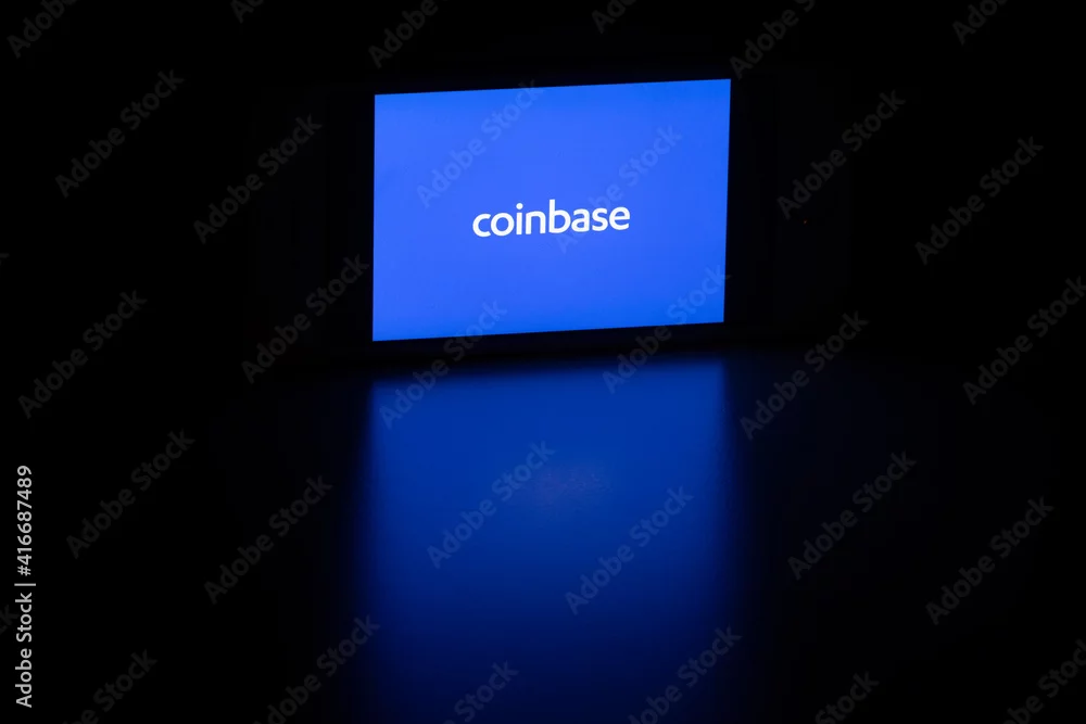 Portland, OR, USA - Feb 25, 2021: Coinbase logo is seen on a smartphone. Coinbase is a US digital currency exchange built on financial technology and based ...