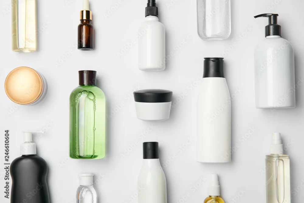Top view of different cosmetic bottles and container on white background
