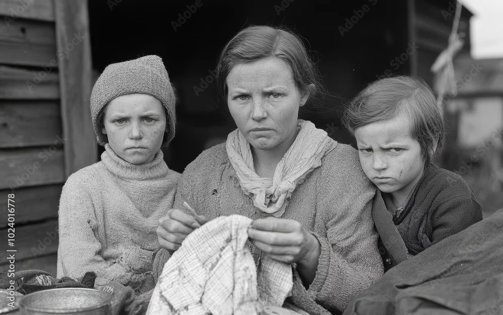 Stark portrayal: black and white depiction of Great Depression's drama, capturing intense hardship, emotional struggles, bleak realities of turbulent era through striking contrasts, powerful imagery.