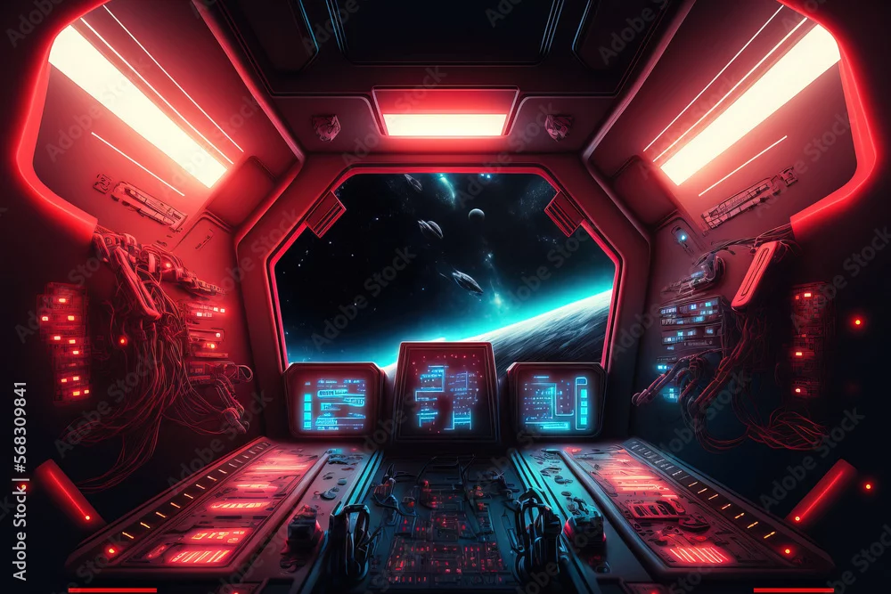 Interior of a dark spaceship with blazing red and blue lights. futuristic spacecraft with a huge window and control consoles for viewing planets in space. Generative AI