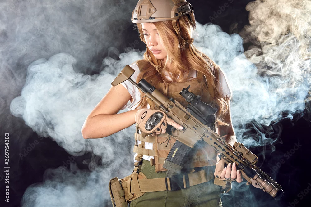 Young blonde female snipper in military outfit with assault rifle in studio on smoky dark background. Women in military service concept.